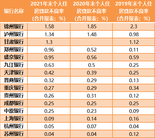 Wind数据显示,2021年末,部分银行个人住房贷款的不良贷款率也在微升,但是与房地产业贷款相比,资产质量偏好。大部分银行个人住房贷款的不良率在1%以下。仅有锦州银行、泸州银行(01983.HK)、甘肃银行个人住房贷款的不良率在1%以上,分别为1.58%、1.34%、1.3%。
