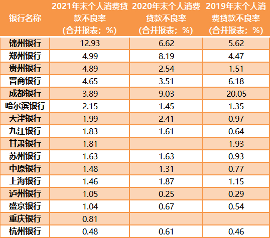 不过,随着前些年粗狂式的经营,城商行在个人消费贷款中的资产出现了恶化。截至2021年末,锦州银行个人消费贷款的不良率最高,为12.93%。郑州银行个人消费贷款的不良率接近5%。贵州银行个人消费贷款的不良率为4.89%。