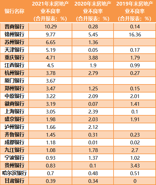 另外,绝大多数银行在2021年的房地产业贷款风险大幅提升。其中,晋商银行(02558.HK)、锦州银行(00416.HK)不良率均在10%左右,分别为10.29%、9.77%,较2020年末增长了10.01个百分点、4.32个百分点。