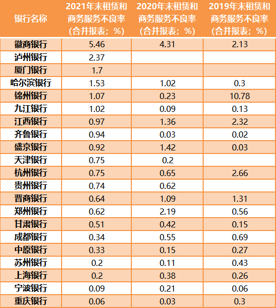 除徽商银行,哈尔滨银行、九江银行(06190.HK)、齐鲁银行(601665.SH)等多家银行租赁和商务服务贷款的不良率也出现上升。例如,2019年-2021年,哈尔滨银行租赁和商务服务不良率分别是0.3%、1.02%、1.53%,九江银行不良率分别是0.13%、0.09%、1.02%,齐鲁银行的不良率分别是0.02%、0.03%、0.94%。