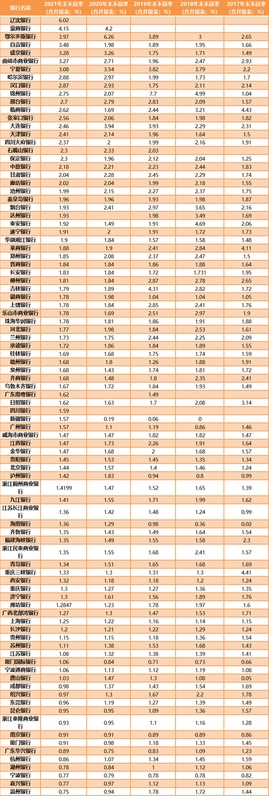 在已经公布不良率的近100家城商行中,2021年末有7家银行的不良率在3%以上。例如,辽沈银行不良率为6.02%,蒙商银行不良率为4.15%,鄂尔多斯银行不良率为3.97%,自贡银行不良率为3.48%,盛京银行不良率为3.28%,曲靖市商业银行不良率为3.27%,宁夏银行不良率为3.08%。