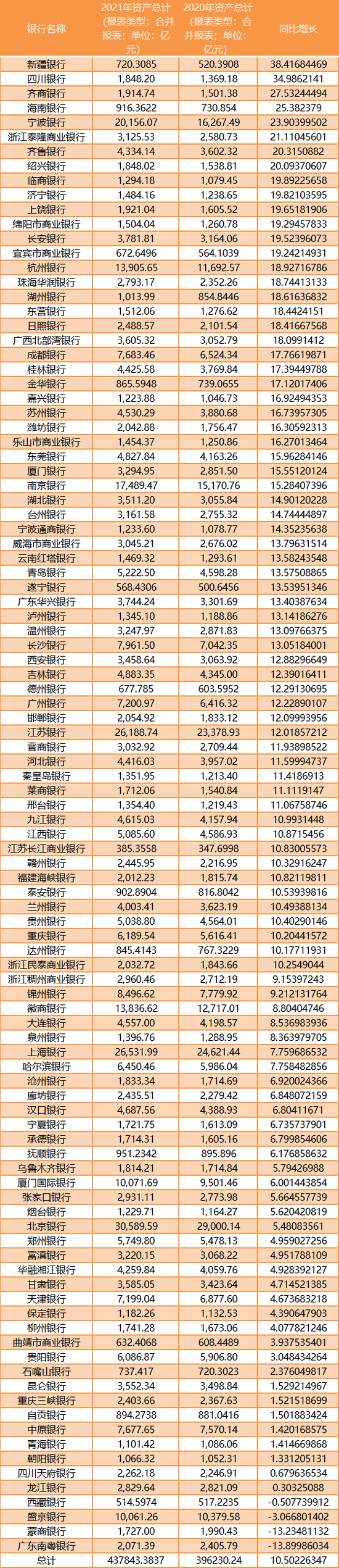 《财经》记者根据Wind统计的103家城商行数据显示,2021年这103家城商行的总资产规模为43.78万亿元,同比2020年上升了10.5%。
