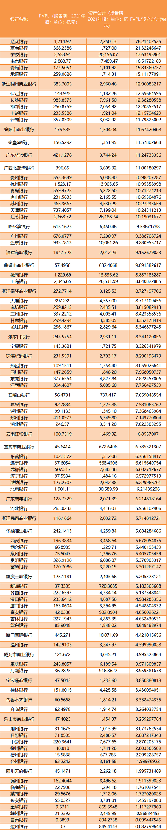 2021年报中,有近100家城商行披露了同业投资中的“以公允价值计量且变动计入当期损益的金融资产(FVPL)”这一科目。该科目被认为是流动性不好资产(包括非标)的集中地。