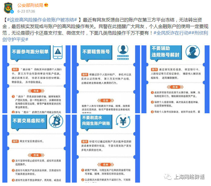 对此,公安部刑事侦查局官方微博在6月23日发布提醒称,不要对个人的金融账户——包括银行卡、支付宝、微信支付等——进行5种操作,它们都属于高风险操作,可能导致账户被冻结——