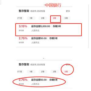 以中国银行为例,目前3年期定存利率最高为3.15%,而5年定存最高利率只有2.75%。建行3年期和5年期定存利率均为2.75%,但三年内定存达到5万元可上浮至3.15%。工行50元起存的3年期整存整取利率最高可达到3.15%,5年期整存整取利率却仍为2.75%。