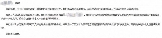 “非常抱歉,由于公司职能调整,您应聘的岗位职能被合并,无法推动录用流程,无法按之前的录用通知及三方协议与您签订劳动合同。”该公司在解约邮件中写道。