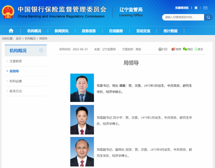 澎湃新闻注意到,辽宁银保监局网站局领导页面显示,目前,该局领导班子中有党委书记、局长一名,党委副书记两名,党委委员三名。就36家银保监局官网披露的局领导信息来看,仅有辽宁、内蒙古、山西、青岛4地银保监局设置了党委副书记一职,辽宁银保监局则设置了两位党委副书记,因而稍显特殊。