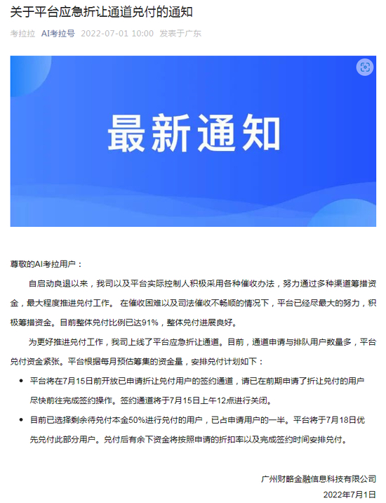 月初,广州P2P平台“AI考拉”对外发布了《关于平台应急折让通道兑付的通知》。通知称,目前整体兑付比例已达91%,整体兑付进展良好。平台将在7月15日前开放已申请折让兑付用户的签约通道,签约通道将于7月15日上午12点进行关闭。