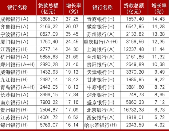 表3 上市城商行2021年贷款余额及增长幅度(按增长率降序排列)