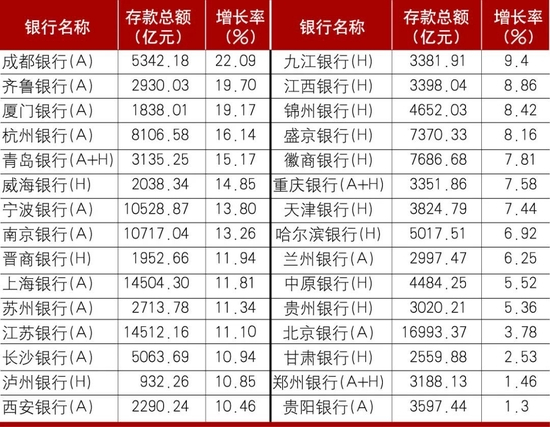 表4 上市城商行2021年存款总额及增长幅度(按增长率降序排列)