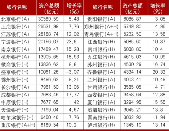 表2 上市城商行2021年资产总额及增长率(按资产总额降序排列)