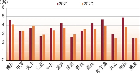 拨贷比的监管要求是不小于2.5%。2021年,各上市城商行都满足了监管指标,其中有14家银行提高了拨贷比。提高幅度最大的是贵州银行(1.6个百分点);郑州银行拨贷比下降了0.43个百分点,降幅最大。共有8家城商行的拨贷比超过4%,拨贷比最高的是贵州银行(4.9%);6家城商行拨贷比低于3%,最低的是威海银行(2.53%)(见图13、图14)。
