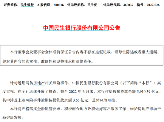 民生银行:针对近期网传房地产相关风险事件,中国民生银行股份有限公司(以下简称“本行”)高度重视,在全行迅速开展了排查。截至2022年6月末,本行住房按揭贷款余额5,910.39亿元,其中涉及上述风险事件逾期按揭贷款余额0.66亿元,总体风险可控。