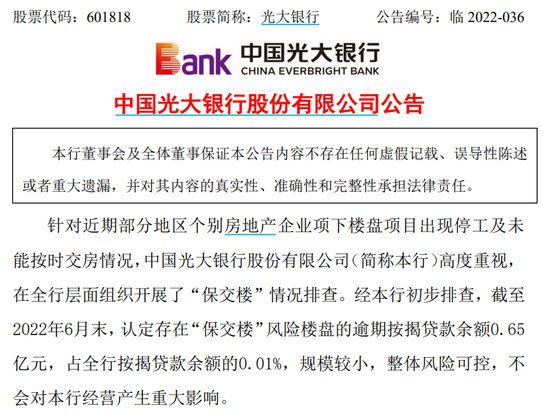 光大银行:整体风险可控,不会对本行经营产生重大影响。
