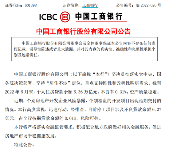 工商银行公告,近期,个别房地产开发企业风险暴露,个别楼盘的开发项目出现延期交付的情况。本行高度重视,迅速行动,经排查,目前停工项目涉及不良贷款余额6.37亿元,占全行按揭贷款余额的0.01%,风险可控。