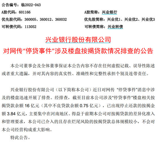 兴业银行在公告中称,近日对网传“停贷事件”消息中涉及的楼盘迅速开展了排查。经排查,截至目前本公司涉及“停贷事件”楼盘相关按揭贷款余额16亿元(其中不良贷款余额 0.75 亿元),已出现停止还款的按揭金额3.84亿元,主要集中在河南地区。得益于前期本公司对按揭贷款的差异化准入和管理要求,本公司已介入的且存在烂尾风险的按揭贷款总体规模较小,不会对本公司经营构成重大影响。