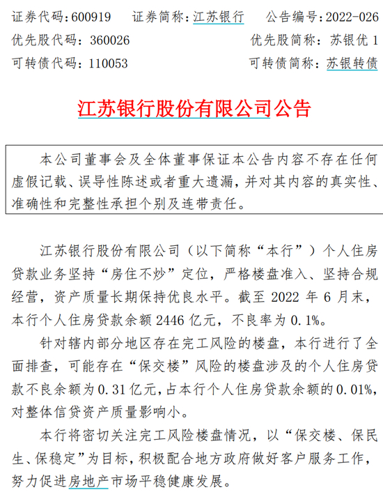 江苏银行:针对辖内部分地区存在完工风险的楼盘,本行进行了全面排查,可能存在“保交楼”风险的楼盘涉及的个人住房贷款不良余额为0.31亿元,占本行个人住房贷款余额的0.01%,对整体信贷资产质量影响小。
