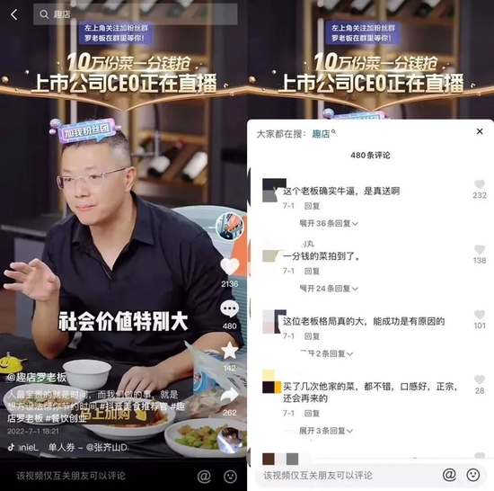 7月18日下午,趣店趁热打铁举办了声势浩大的预制菜品牌战略发布会,高调宣布进入预制菜赛道。当晚,罗敏在东方甄选直播间连刷十个嘉年华,并在一天后发视频自爆被董宇辉拉黑。