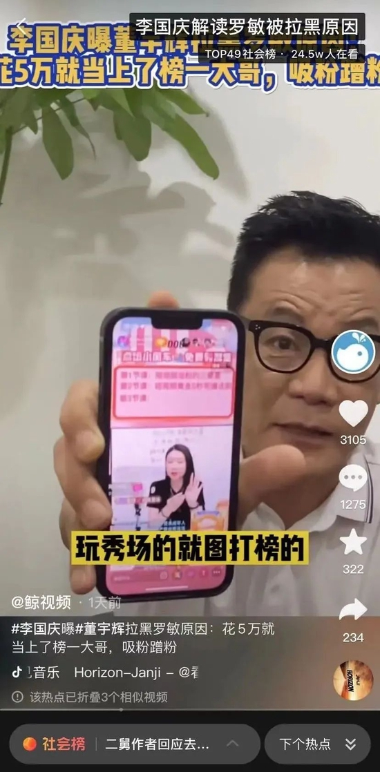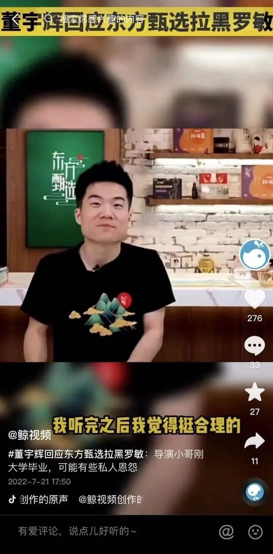 即便没有“被东方甄选直播间拉黑”的戏剧发展,罗老板想要翻红也不容易。主播董宇辉在回应“拉黑事件”时表示,“导演小哥因为大学刚毕业,有时候有些私人恩怨,他要拉黑,我听完后觉得挺合理的。”