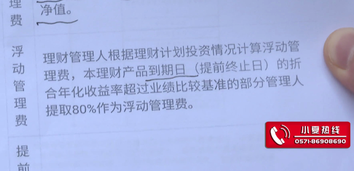 在甘先生购买理财产品的合同当中记者看到,如果产品的年化收益高于银行承诺的预期的话,那么高出的部分银行要扣走80%作为浮动管理费。但是让甘先生想不明白的是,理财产品都还没有到期,所以年化收益到底是赚还是赔都还是个未知数,凭什么银行现在就扣除浮动管理费,对此杭州银行方面能够给出什么解释,记者陪同甘先生去了一趟杭州银行慈溪支行。