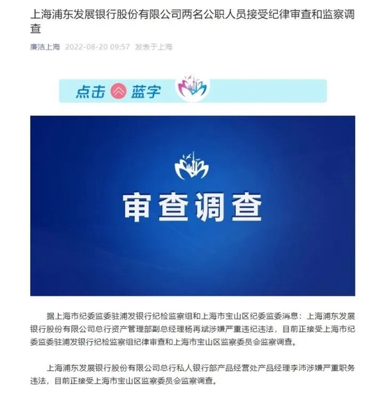 同日,“廉洁上海”公布消息称,上海浦东发展银行股份有限公司两名公职人员接受纪律审查和监察调查,分别为浦发银行总行资产管理部副总经理杨再斌和浦发银行总行私人银行部产品经营处产品经理李沛,涉嫌严重违纪违法和严重职务违法。