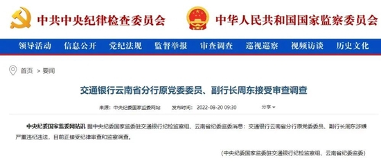 8月20日,中央纪委国家监委驻交通银行纪检监察组、云南省纪委监委消息:交通银行云南省分行原党委委员、副行长周东涉嫌严重违纪违法,目前正接受纪律审查和监察调查。