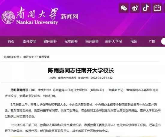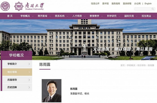 目前,南开大学官网“现任领导”栏目中,已出现陈雨露的信息。有消息人士表示,陈雨露昨日已到南开大学。