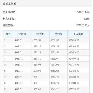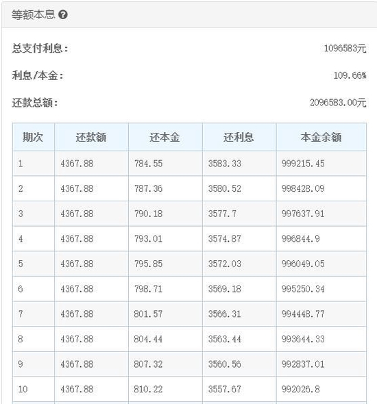 如果按照40年的贷款期限来计算,依旧是等额本息,总支付利息为1096583元,还款总额为2096583.00元,每个月还款4367.88元,也就是说,虽然贷款年限增加了10年,但总支付利息也在增加,增加了315045.81元,而每个月的还款金额也仅仅是减少了580.83元。