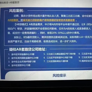 在网络上流传的一张关于“AB套路贷”风险提示的截图中有一则案例,该案例称,黑中介从“AB套路贷”中收取20%~30%以上的中介费用,另外还列举了数个疑似“AB套路贷”的公司地址。