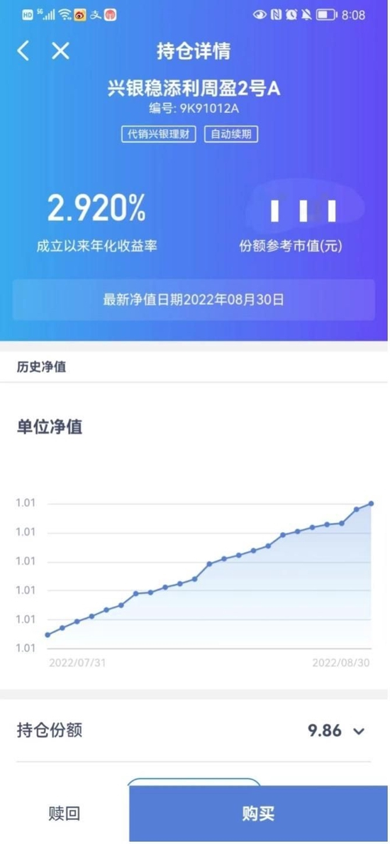 购买理财产品后,兴业银行APP的理财产品持仓页面展示比较简单,展示持仓市值合计,投资者风险等级,以及已起息产品、未起息产品、在途资金。点持仓的具体理财产品进入持仓详情页面后,可以查看到成立以来年化收益率、份额参考市值,单位净值图、持仓份额,以及购买确认时净值等信息。