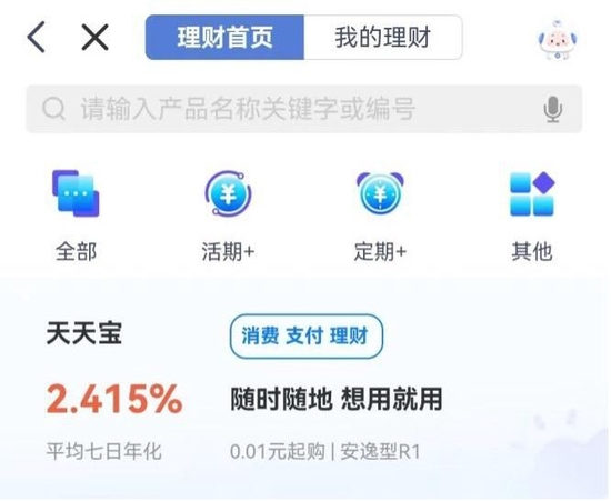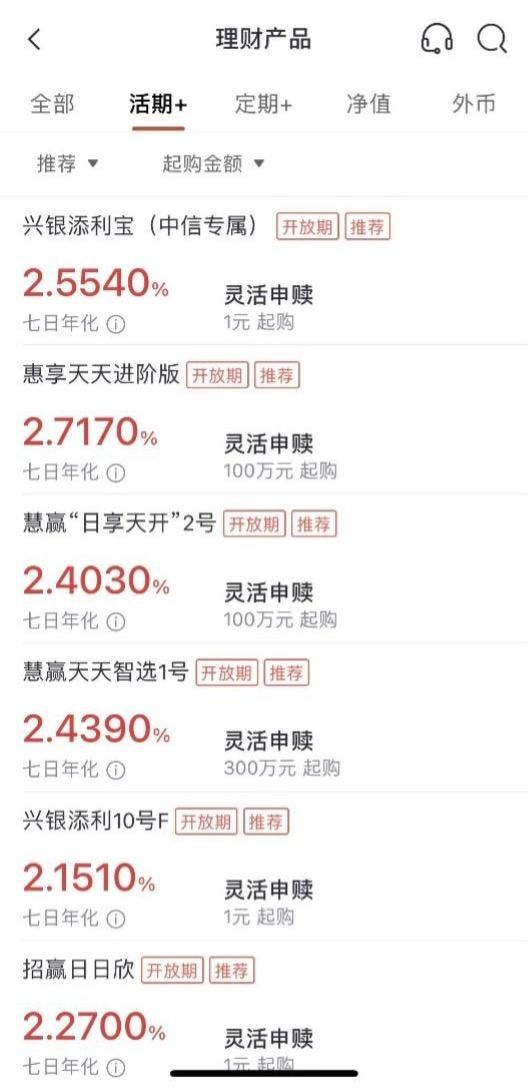 该栏目下主要是现金管理类产品,左侧红字显示收益率,同一采用七日年化收益率的口径。右侧黑字显示“灵活申赎”字样,以及起购金额,页面较为清晰明了。