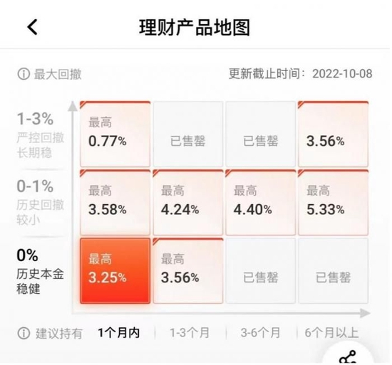在推荐栏下,设置“产品地图”,客户可以按照“最大回撤”和可投资期限,参考收益水平选择适合自己的产品。这个栏目也是每日根据当天产品进行更新的,基本上一目了然,很适合“投资小白”或者没有太多时间研究理财产品的投资者。