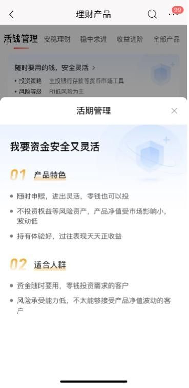 由于按照产品风险收益类型进行分类,招行APP在不同的分类下进行了说明。活钱管理下说明为“随时要用的钱,安全灵活”,投资策略主要为银行存款等货币市场工具;风险等级以R1低风险为主。
