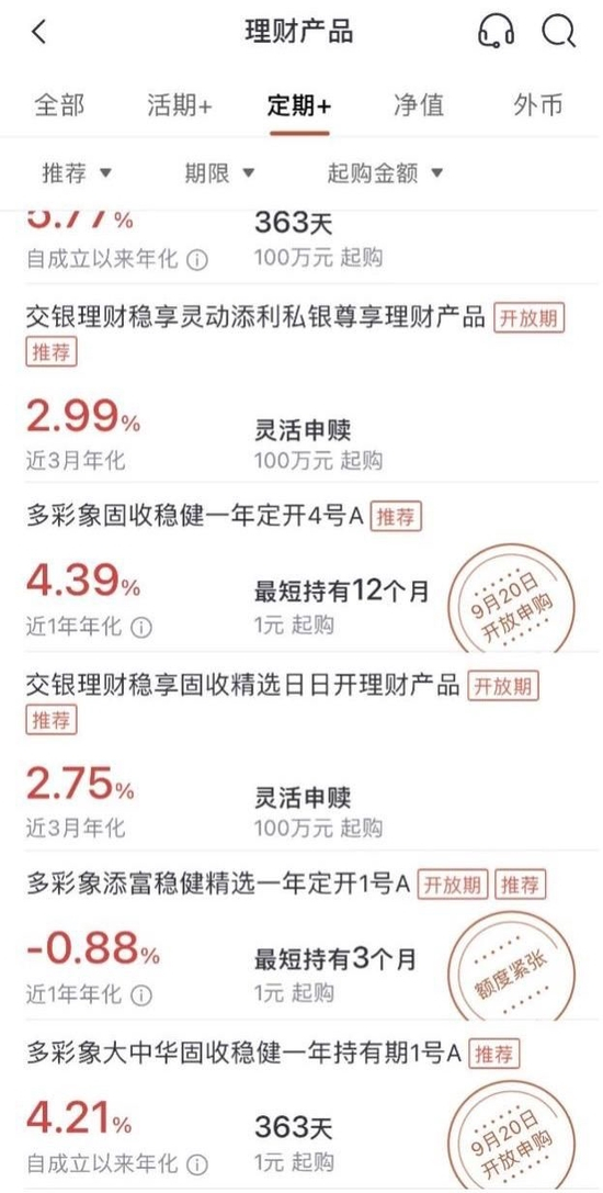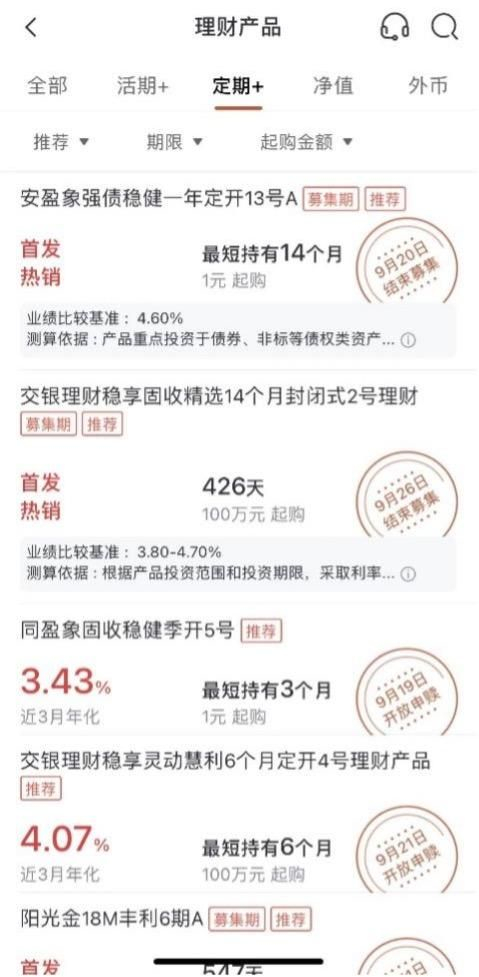 周期类理财产品的列表页收益展示则“五花八门”,有的标红展示近3个月年化收益率,有的标红展示成立以来年化收益率,有的展示近1个月年化收益率,有的展示单位净值。