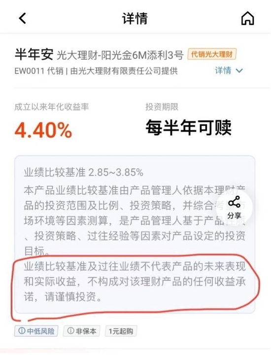 详情页也有“业绩比较基准及过往业绩不代表产品的未来表现和实际收益,不构成对该理财产品的任何收益承诺,请谨慎投资”这句话,建议加粗或者换格式明显提示。