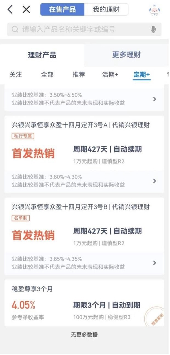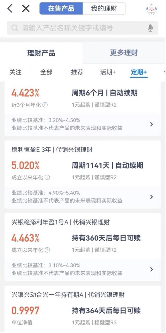 兴业银行APP理财产品页面固定期限产品和周期产品混合在一起展示,均列入定期分类。并且大多以周期产品为主,固定期限产品不多。