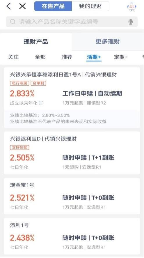 比如活期分类中,既有代销兴银理财发行的产品,又有兴业银行自营的产品“现金宝1号”,“添利1号”。虽然并无代销理财产品跟自营产品分开展示的规定,但将代销兴银理财的产品跟代销其他行理财产品一起展示无疑更有助于突出产品仅为银行代销。从而避免投资者将代销兴银理财产品和兴业银行自营产品混为一谈。