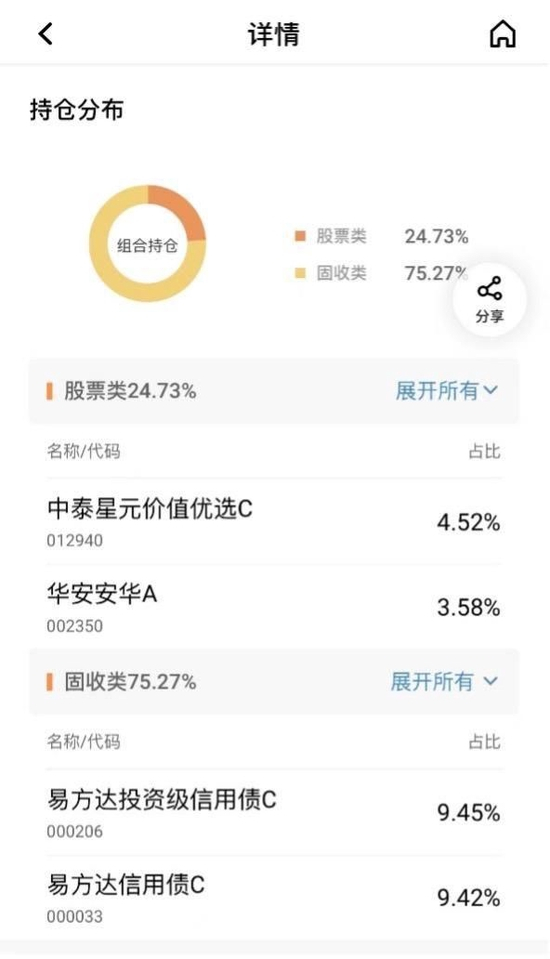 比较惊喜的是,部分产品效仿基金产品,对外公布了“持仓分布”这一项,对于产品最新配置的股票类资产、固收类资产都以简洁直接的方式在详情页公开,而不需要客户自己去翻找查询产品运行公告。