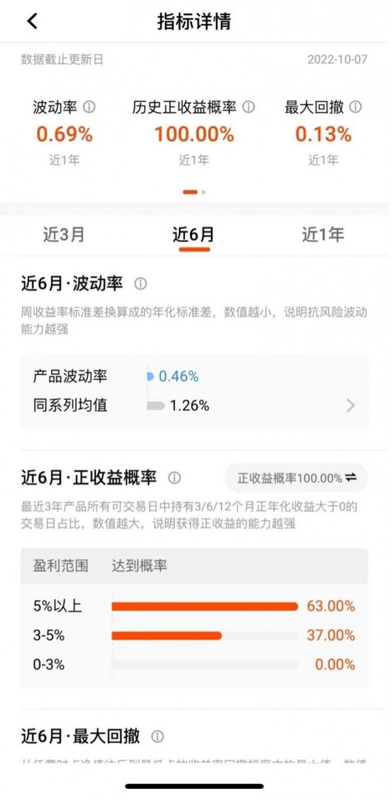 除此之外,比其他银行还多出按照“近3月”“近6月”“近1年”三个时间维度的波动率、历史正收益概率、最大回撤、同系列波动率均值、正收益概率分布的盈利范围、夏普比率、夏普比率同系列均值等等细致的数据,为专业投资者提供了多个衡量产品优劣的角度。