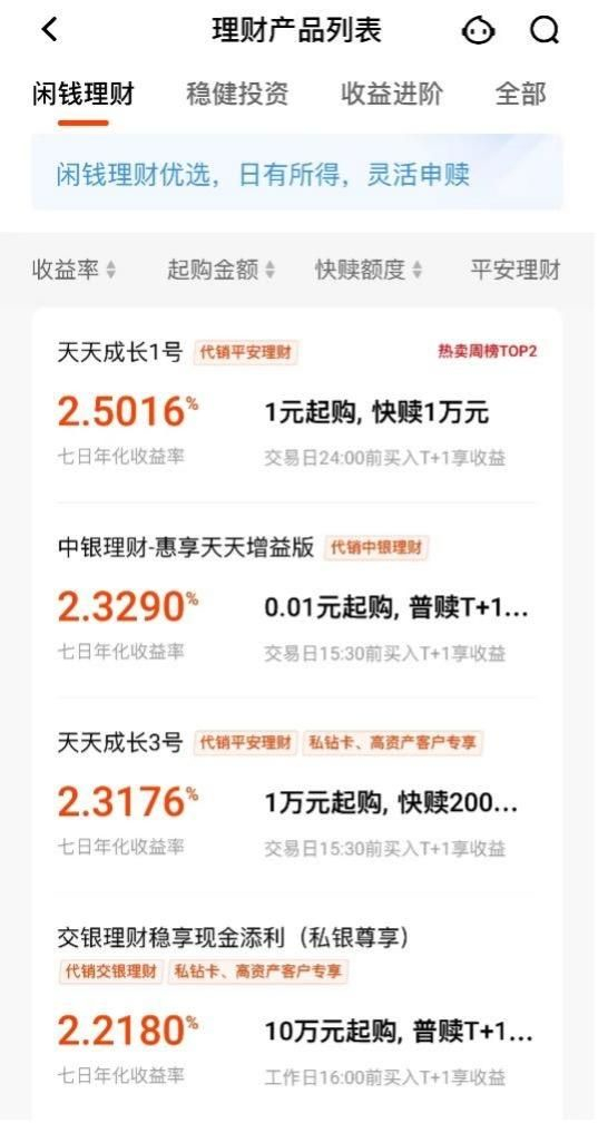 栏目设置上,平安银行也是比较简洁的,设置了“闲钱理财”、“稳健投资”、“收益进阶”三个栏目,并在显著位置加以注解,闲钱理财是灵活申赎产品,稳健投资是主投高等级债券的产品,收益进阶主要是配置权益资产的产品。基本代表了风险收益水平由低到高的变化。