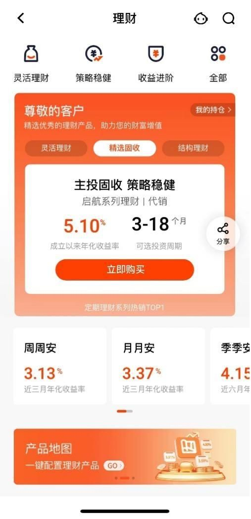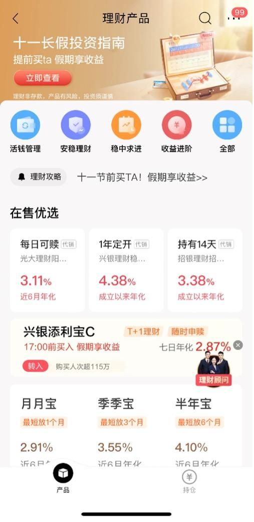 招商银行的银行理财产品页面按照产品风险收益类型分类为“活钱管理”、“安稳理财”、“稳中求进”、“收益进阶”四类,符合投资者的资产配置时的选择逻辑;还有“全部产品”一栏,方便投资者设定个性化筛选方案。在页面展示方面,招行APP的营销意识更强,在国庆假期前,开辟“十一长假投资指南,推出十一期间可以享受收益的产品,并有”在售优选“栏目选取现金管理类、长期固定收益类、短期固定收益类产品,方便投资者快速选择。同时,有理财顾问浮窗,方便投资者随时咨询。