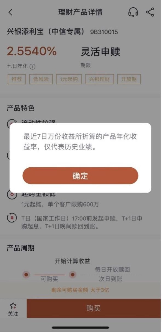从产品业绩展示来看,跟其他银行APP类似,兴业银行APP在展示活期类理财产品列表页面时采用“七日年化”收益率进行标红展示,也有少数产品标红展示“成立以来年化收益率”、“近三个月年化收益率”等。列表页标红展示万份收益的理财产品,点开详情页面还可以查看到七日年化收益率、万份收益、投资期限、起购金额、风险等级等,下方还有图表展示历史收益,包括七日年化收益、万份收益。