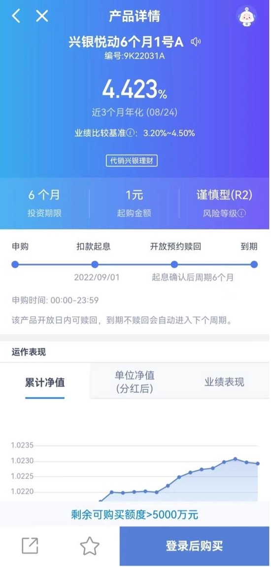 在上述兴业银行发行的固定期限理财产品“稳盈尊享3个月”的详情页面,展示的信息相对较少,页面上方展示了参考净收益率率、投资期限、起购金额、风险等级等。