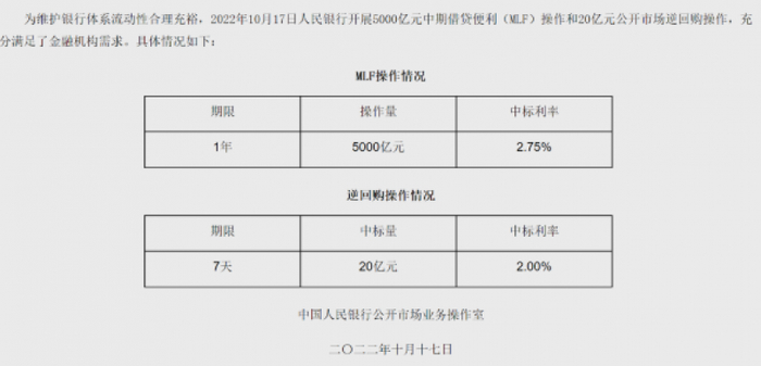 为充分满足金融机构需求,维护银行体系流动性合理充裕,10月17日央行公告称,今日央行开展5000亿元中期借贷便利(MLF)操作和20亿元公开市场逆回购操作。中标利率分别为2.75%和2.00%,均与上期持平。