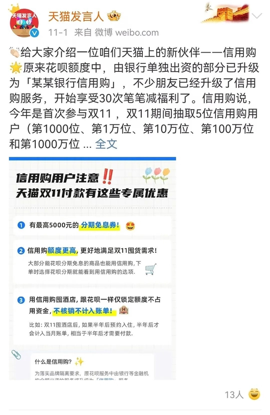 近期,淘宝天猫官方微博号发文称双十一期间信用购也可参加免息分期活动,为刺激用户使用信用购进行付款,在购买天猫产品使用信用购付款后,按顺序第1000位、第1万位、第10万位、第100万位和第1000万位,将会获得帮还双11信用购账单的福利。