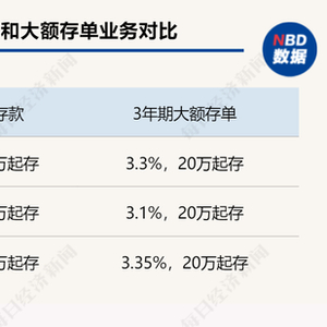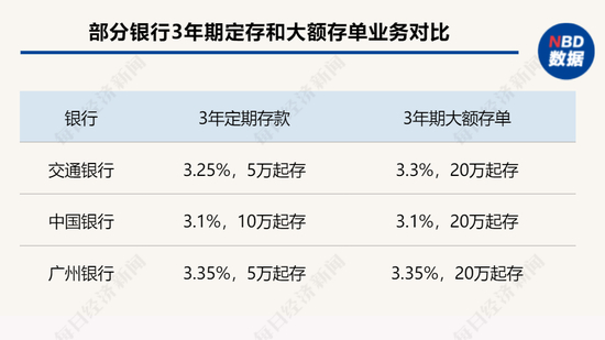此外,记者查阅广州银行存款信息,发现目前该行某款三年定期产品,五万起存,利率为3.35%,和该行3年期大额存单一样。