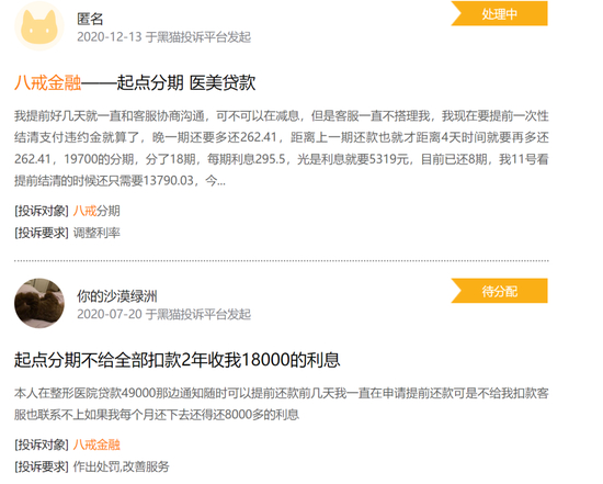 在黑猫投诉上,也有大量用户投诉猪八戒金融收取会员费、不良催收等问题。值得注意的是,有用户提到了该公司旗下的医美贷平台起点分期。媒体报道显示,2018年 6月,八戒金融旗下消费分期产品起点分期正式进军全国医美市场,致力于为医美行业提供消费分期金融服务。