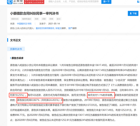 一则小额借款合同纠纷判决书显示,借款人通过猪八戒金融旗下的“小也云贷”申请贷款,日利率0.05,即年化18.25%。此外,猪八戒小贷还向借款人收取每期1%的手续费,即年化12%,合计为年化30.25%;若借款人逾期,还需缴纳年化24.455%的逾期费。