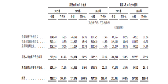雪上加霜的是,猪八戒网的核心业务板块正在面临收入不断下滑的窘境。从招股书来看,猪八戒网的收入结构主要分成四部分,分别是提供企业服务、智慧企业服务、产业服务以及政府区域企业服务生态促进合作。其中智慧企业服务也就是代理记账和商标代理业务,其收入占比达到40%以上,是猪八戒网重要的营收来源,然而2022上半年智慧企业服务实现营收1.17亿元,同比下滑26.7%。