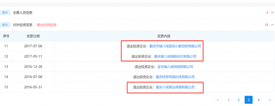 除此以外,猪八戒网还曾手握私募基金、小额贷款、保险经纪、商业保理等四张张金融牌照。在2016-2018年,公司已先后退出投资企业重庆八戒商业保理有限公司、重庆猪八戒保险经纪有限公司(以下简称“猪八戒保险”)、重庆市猪八戒宜创小额贷款有限公司(以下简称“猪八戒小贷”)、重庆猪八戒股权投资基金管理有限公司。2020年12月23日,猪八戒保险经纪被注销。